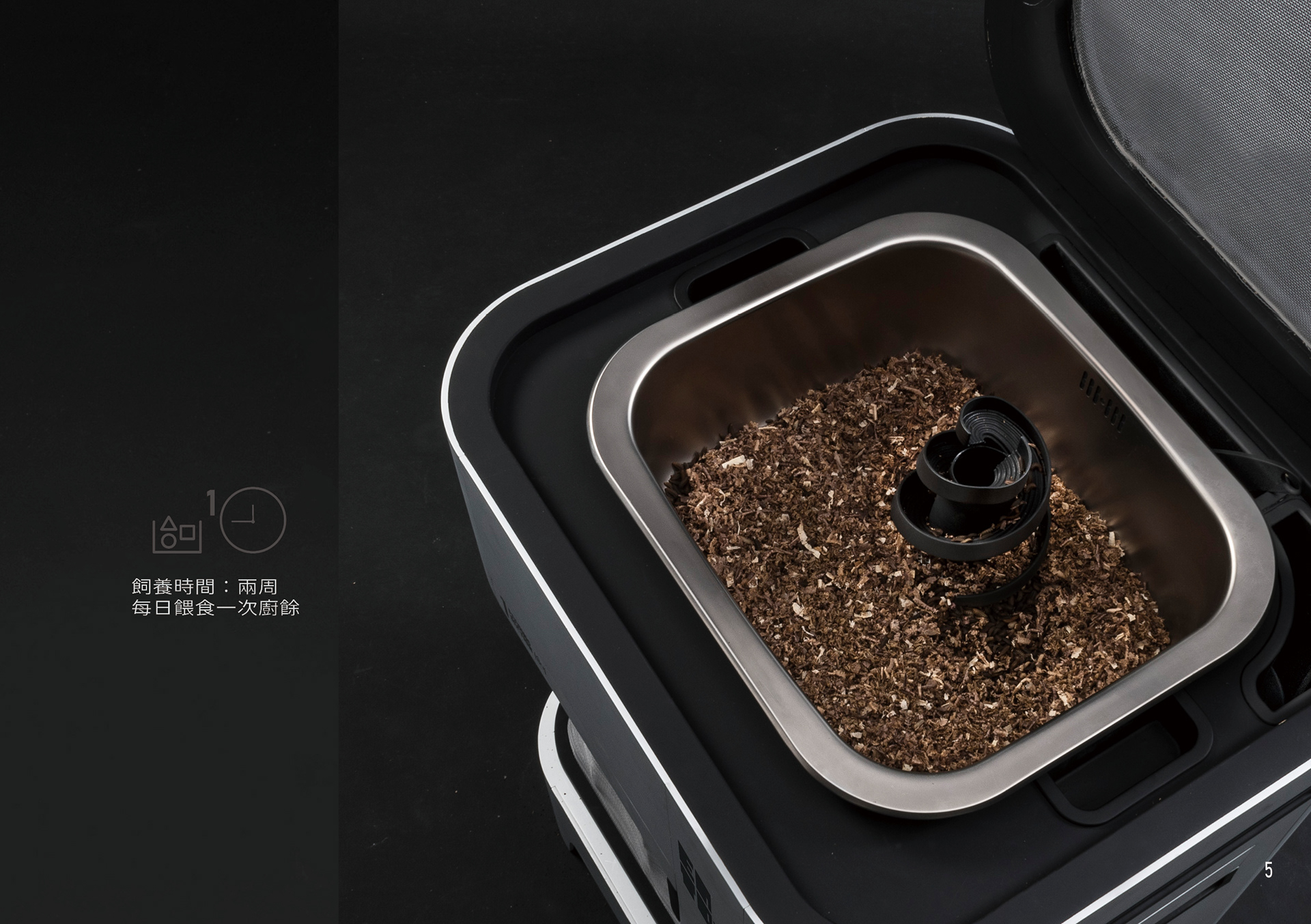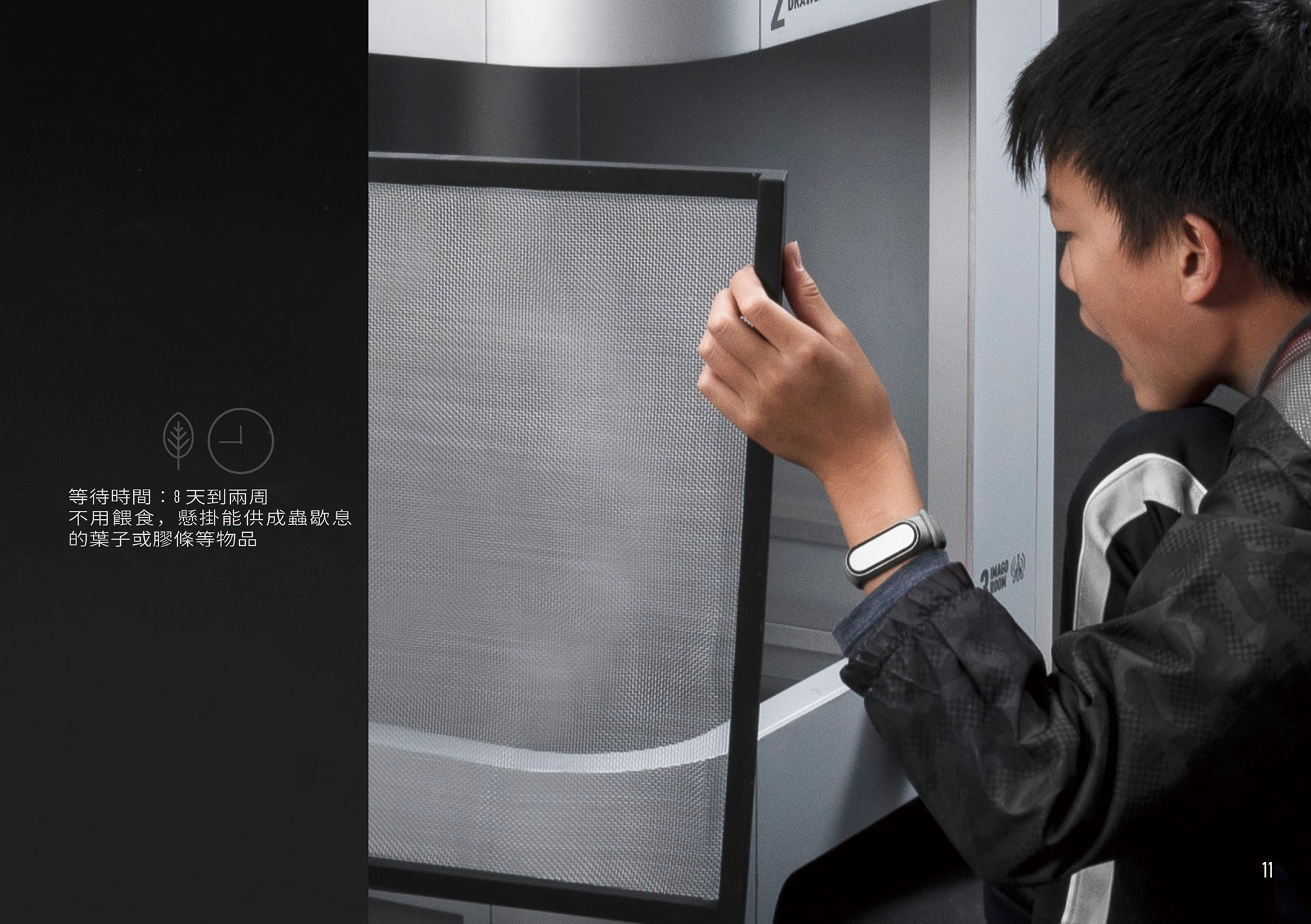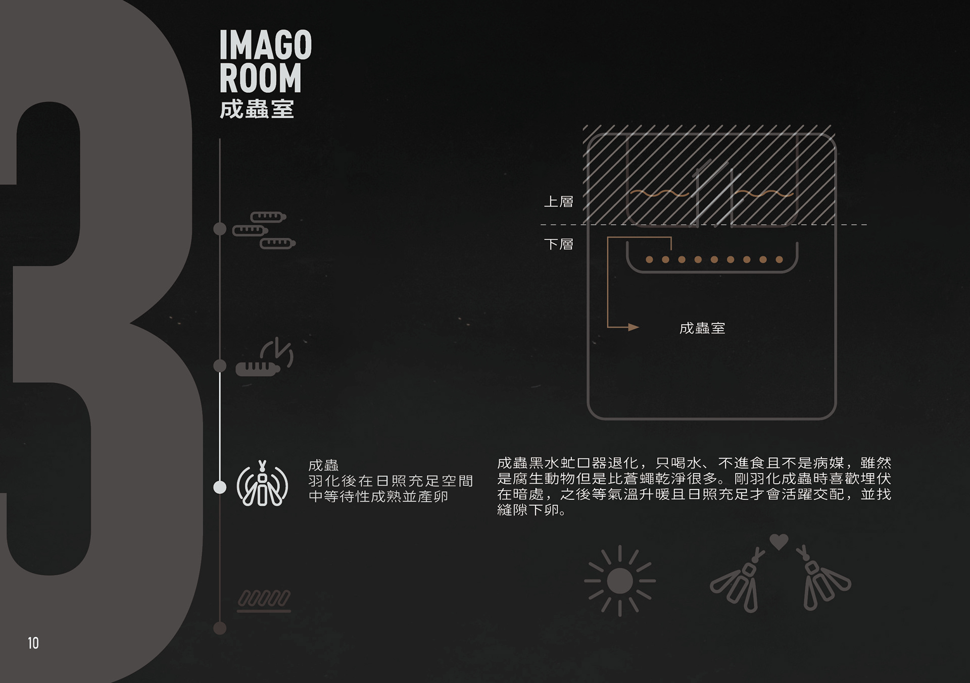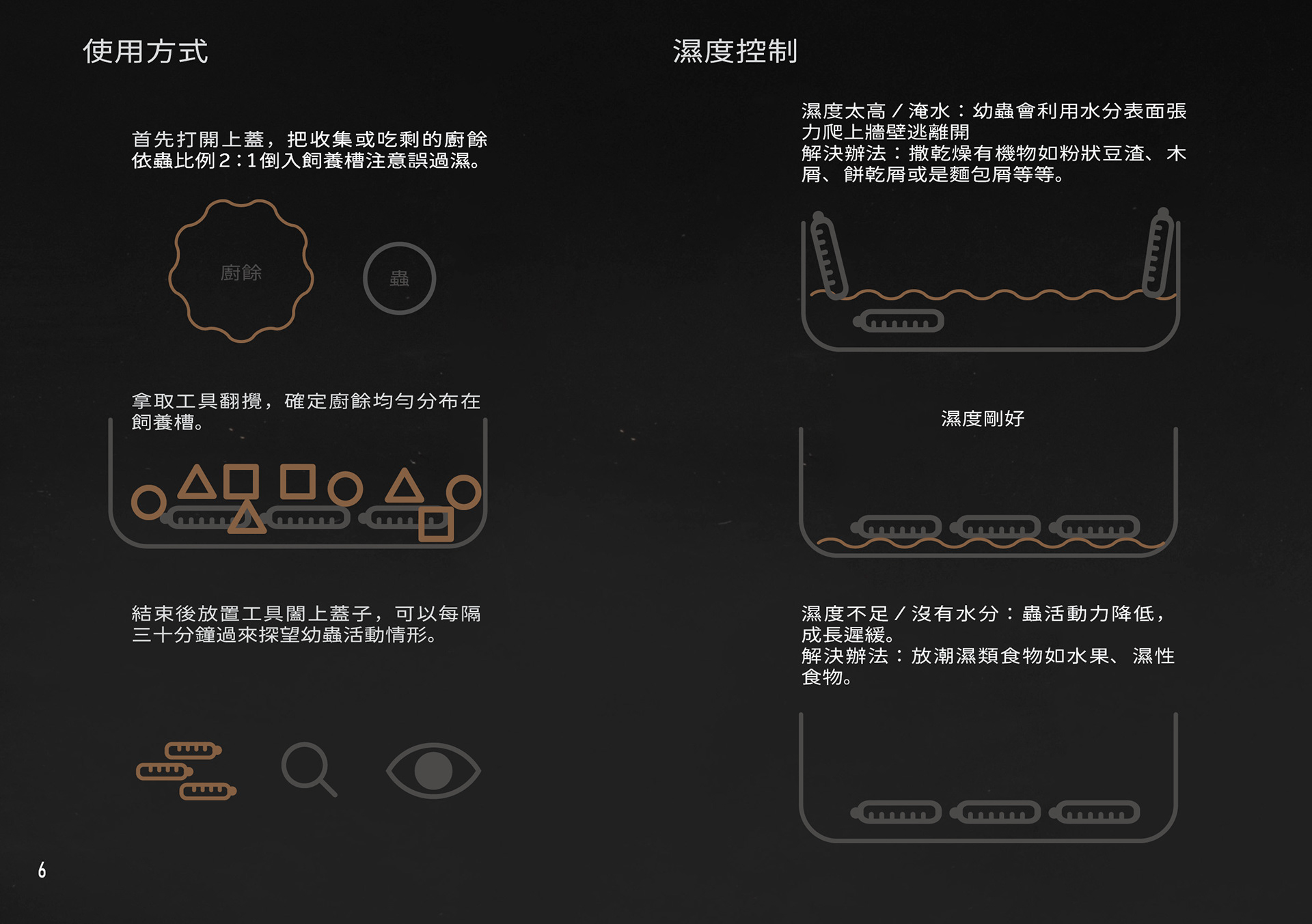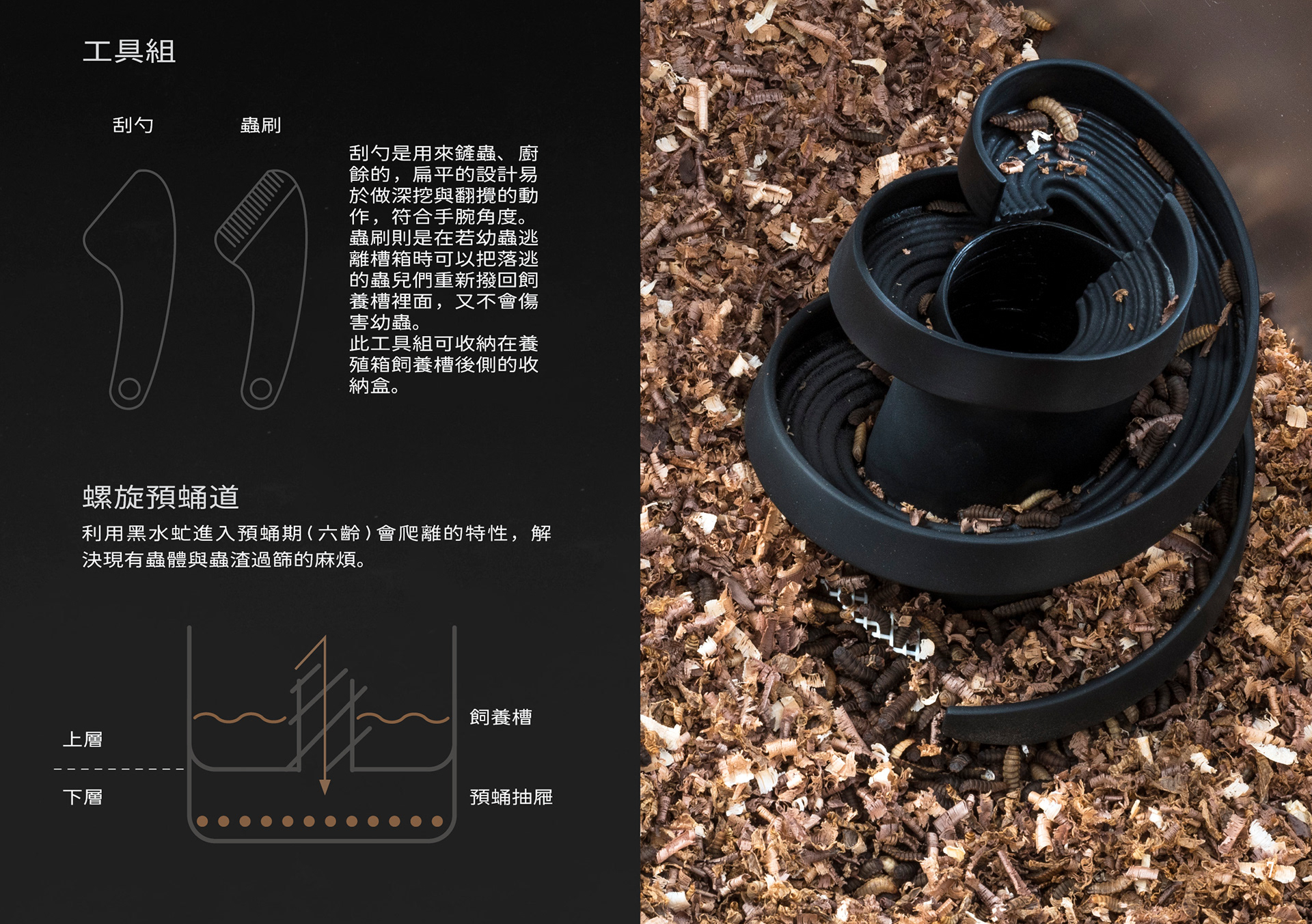 黑水虻是一種能日夜進食處理廚餘、同時轉化廚餘養分為蛋白質的腐食性昆蟲,我們因此決定設計與優化與其相關養殖裝置。它有以下特點: