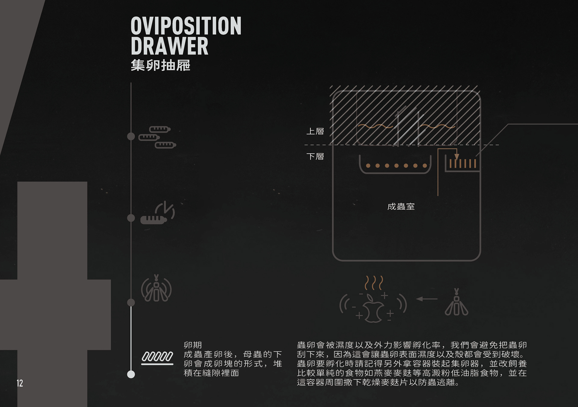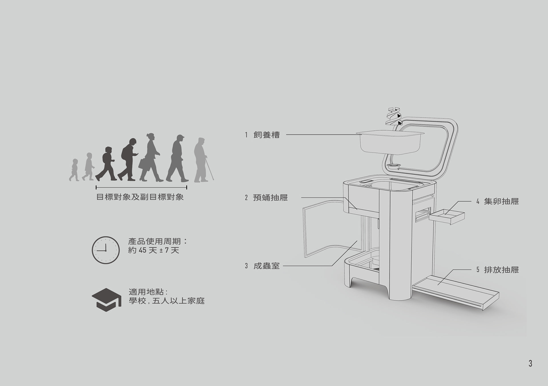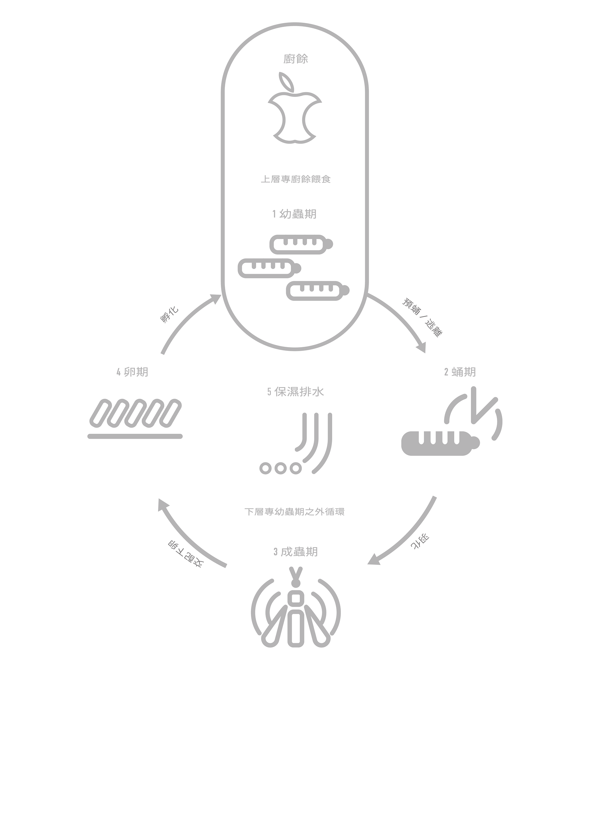Ento.edu黑水虻教育養殖裝置,整合黑水虻飼養流程於一體,垂直設置優化蟲體成長以及學童的觀察操作;我們把最費時的生長階段(約2周),也就是幼蟲期,放在最上層以優化餵食廚餘等地操作,其餘生長階段,不需要耗費太多人力的過程,如:預蛹、羽化和繁殖等等,則整合在下層。
