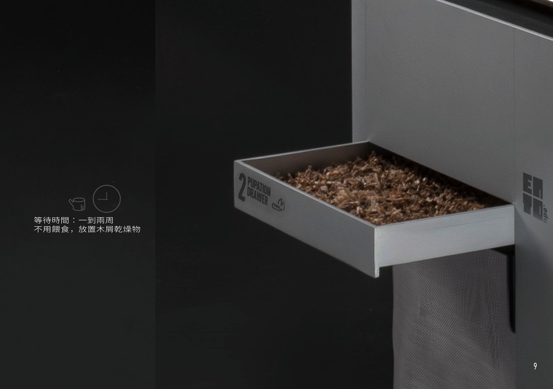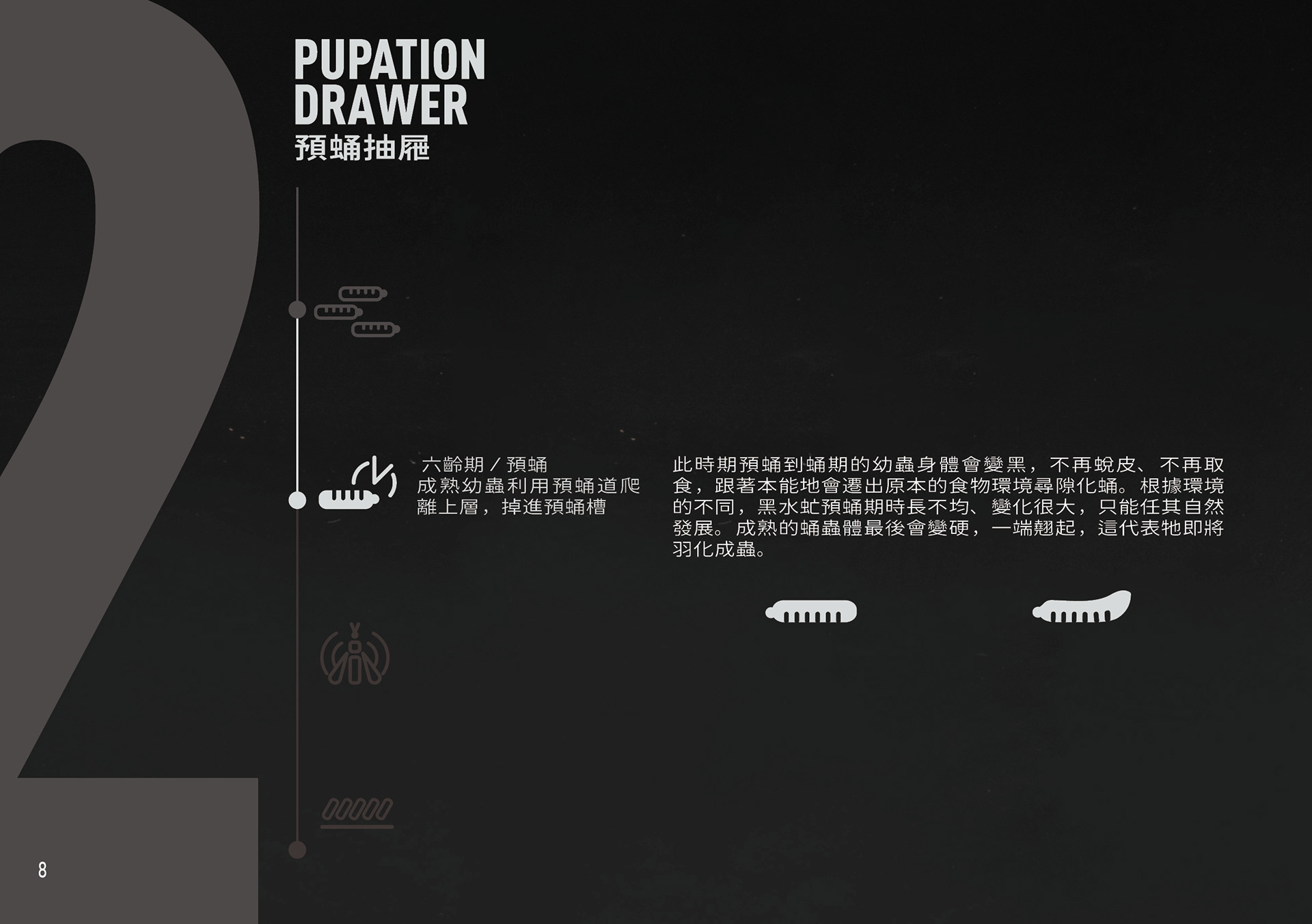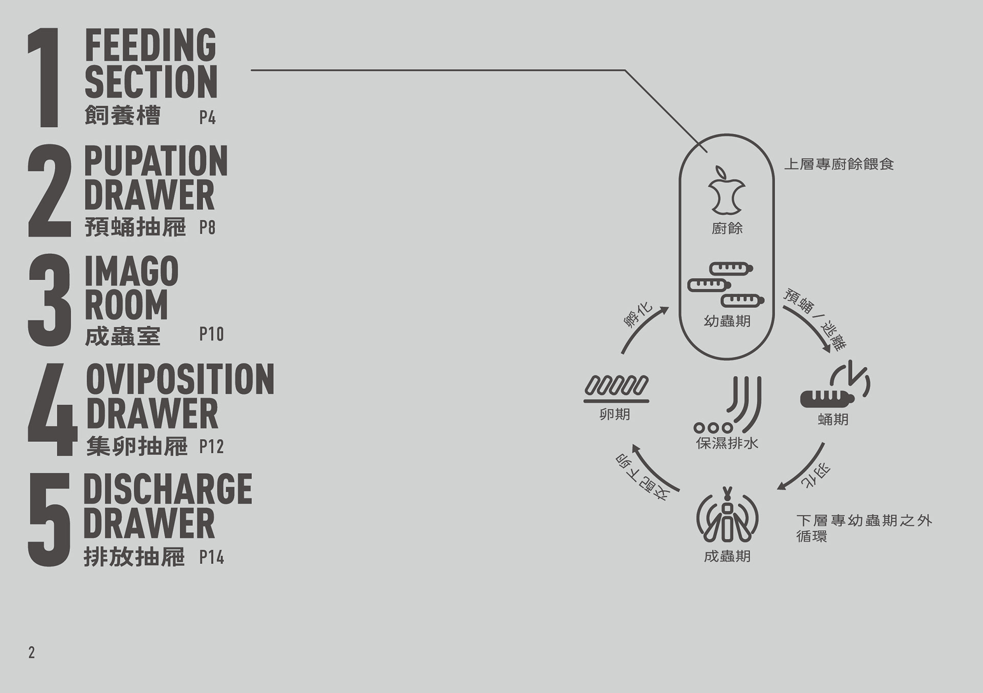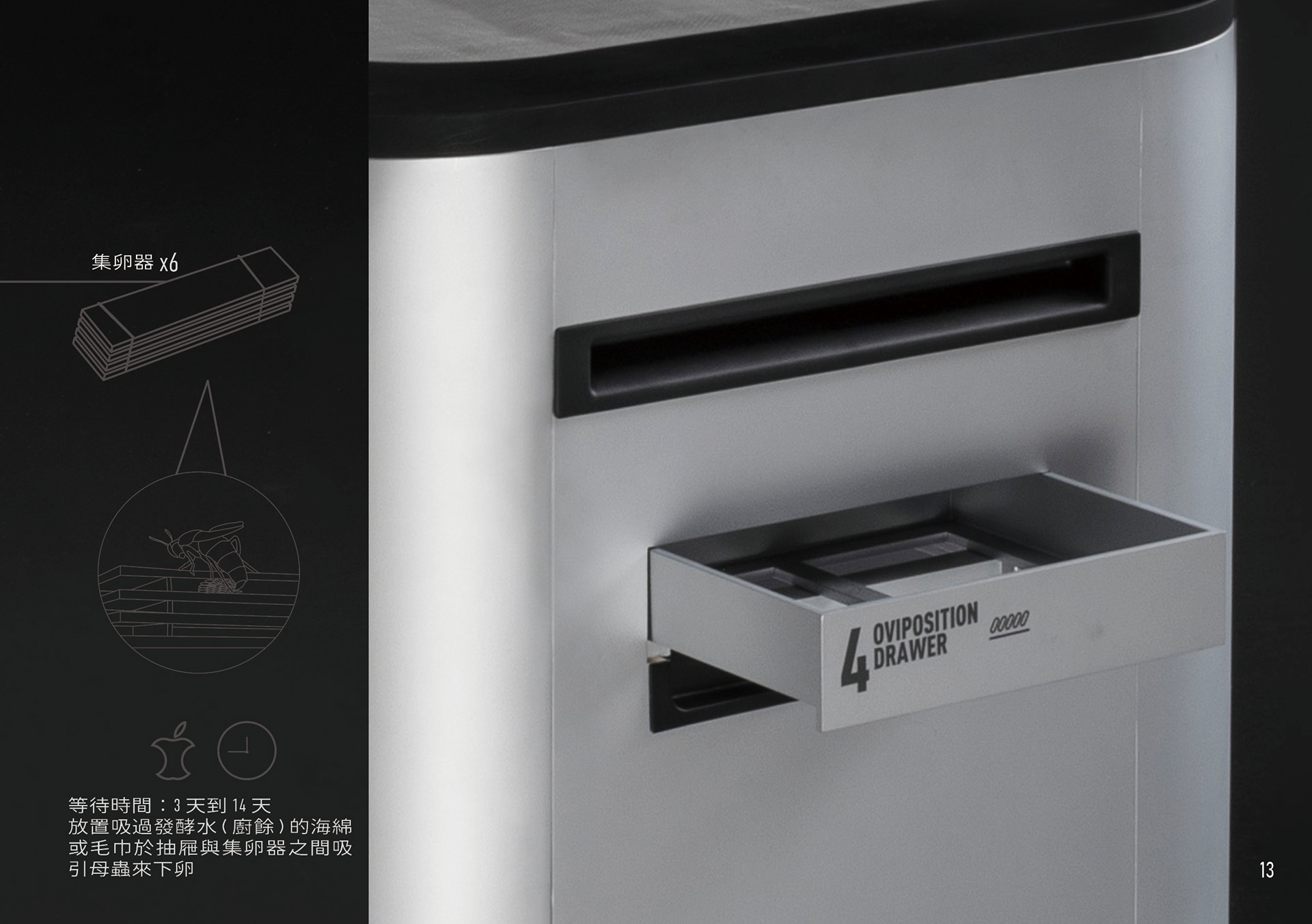 Ento.edu黑水虻教育養殖裝置,整合黑水虻飼養流程於一體,垂直設置優化蟲體成長以及學童的觀察操作;我們把最費時的生長階段(約2周),也就是幼蟲期,放在最上層以優化餵食廚餘等地操作,其餘生長階段,不需要耗費太多人力的過程,如:預蛹、羽化和繁殖等等,則整合在下層。