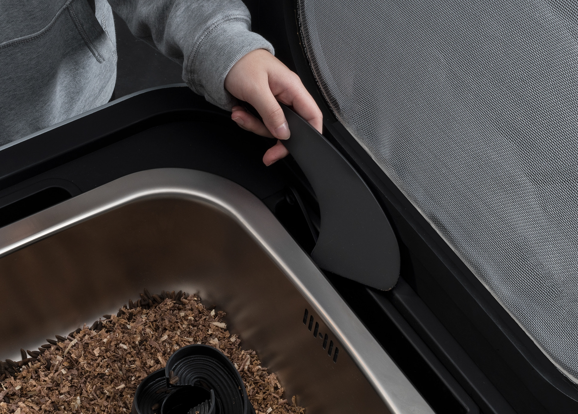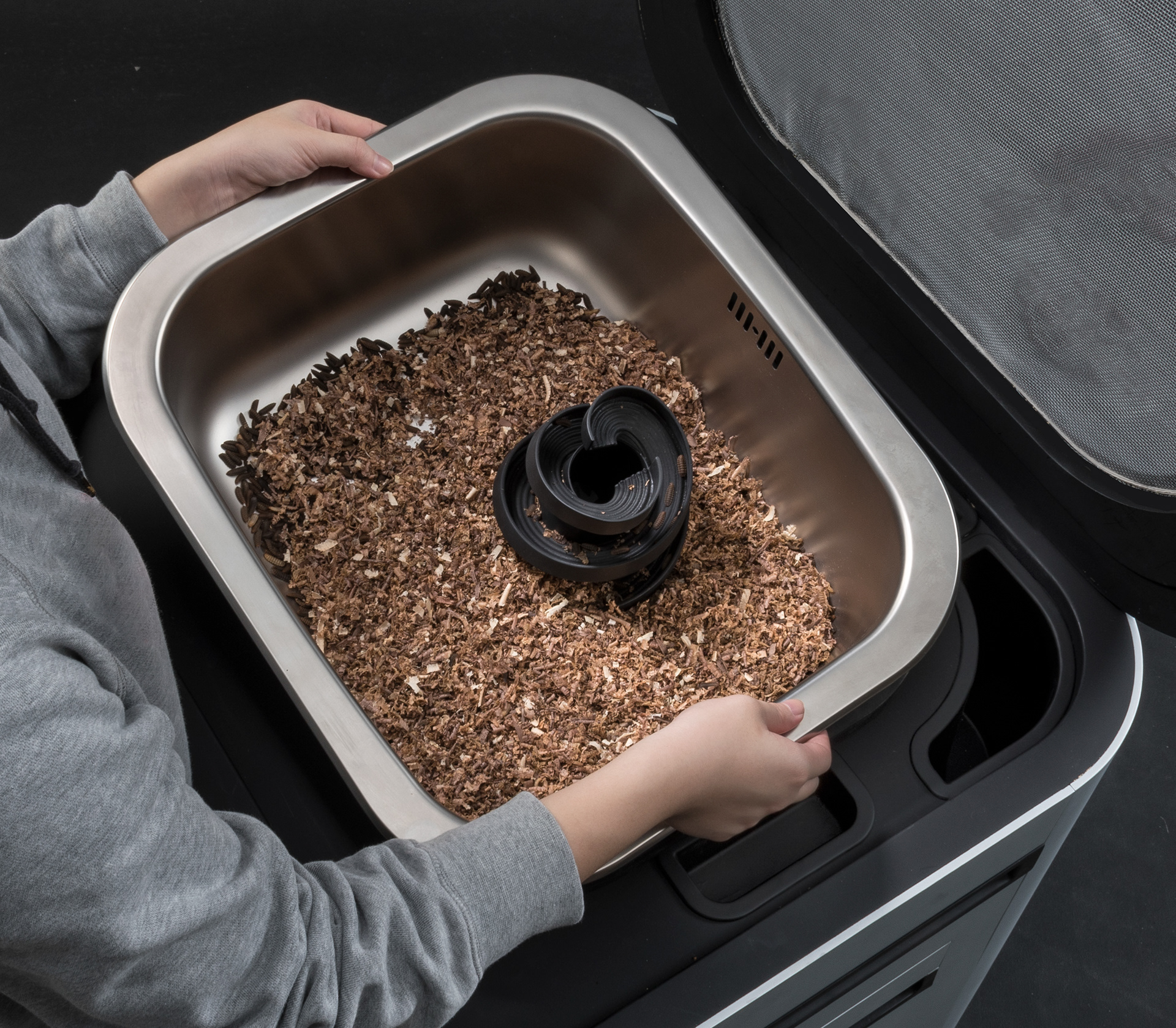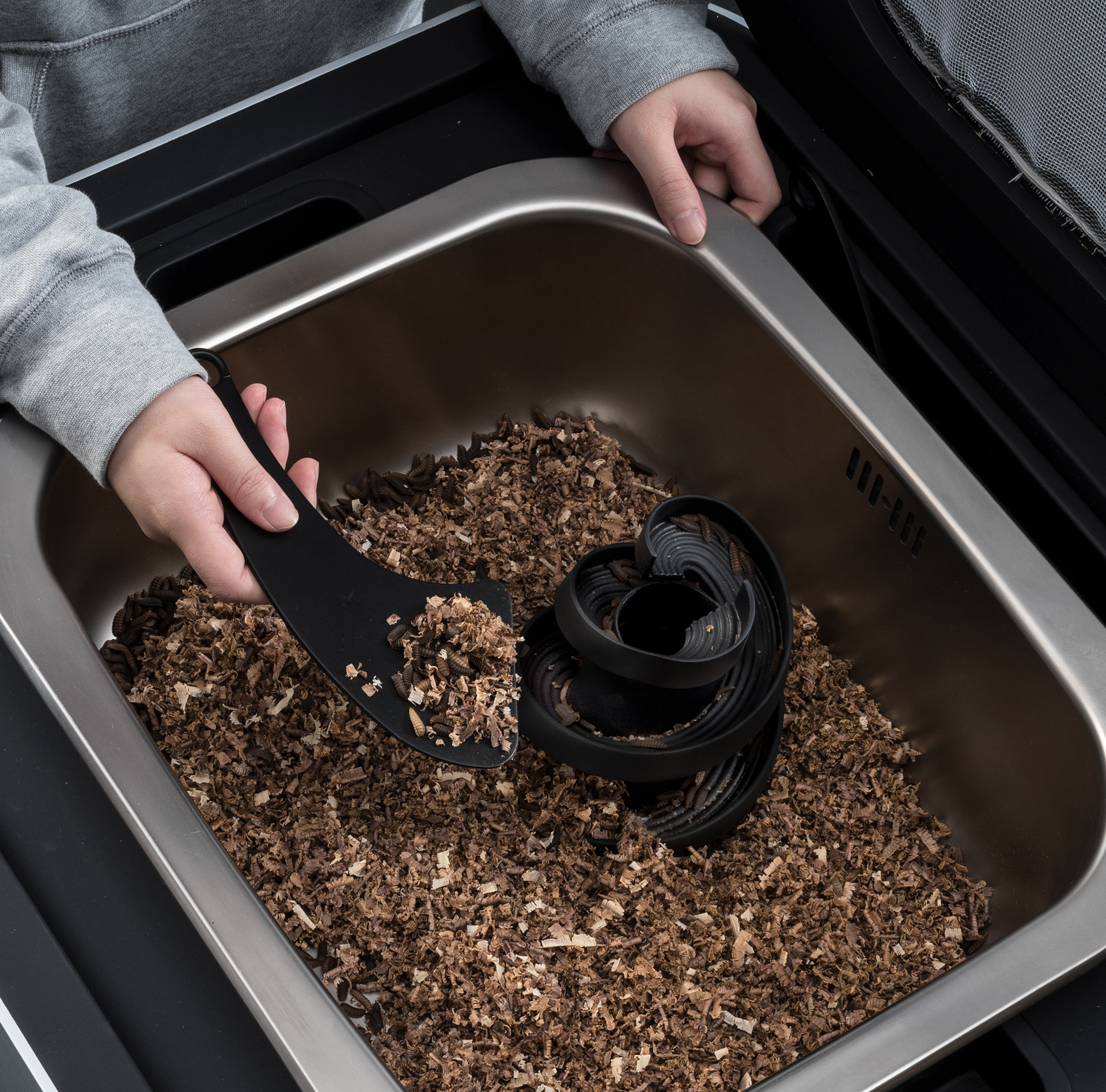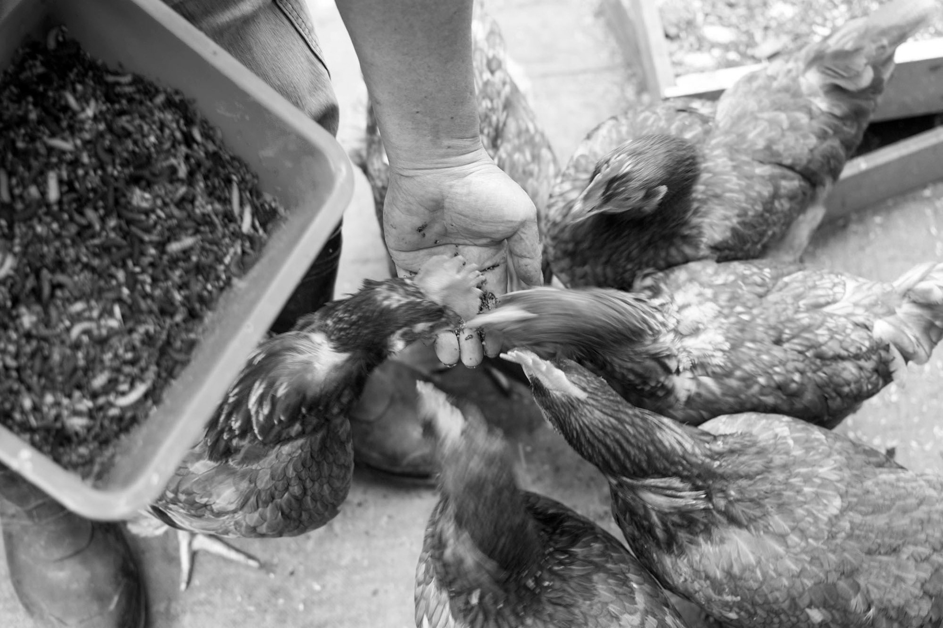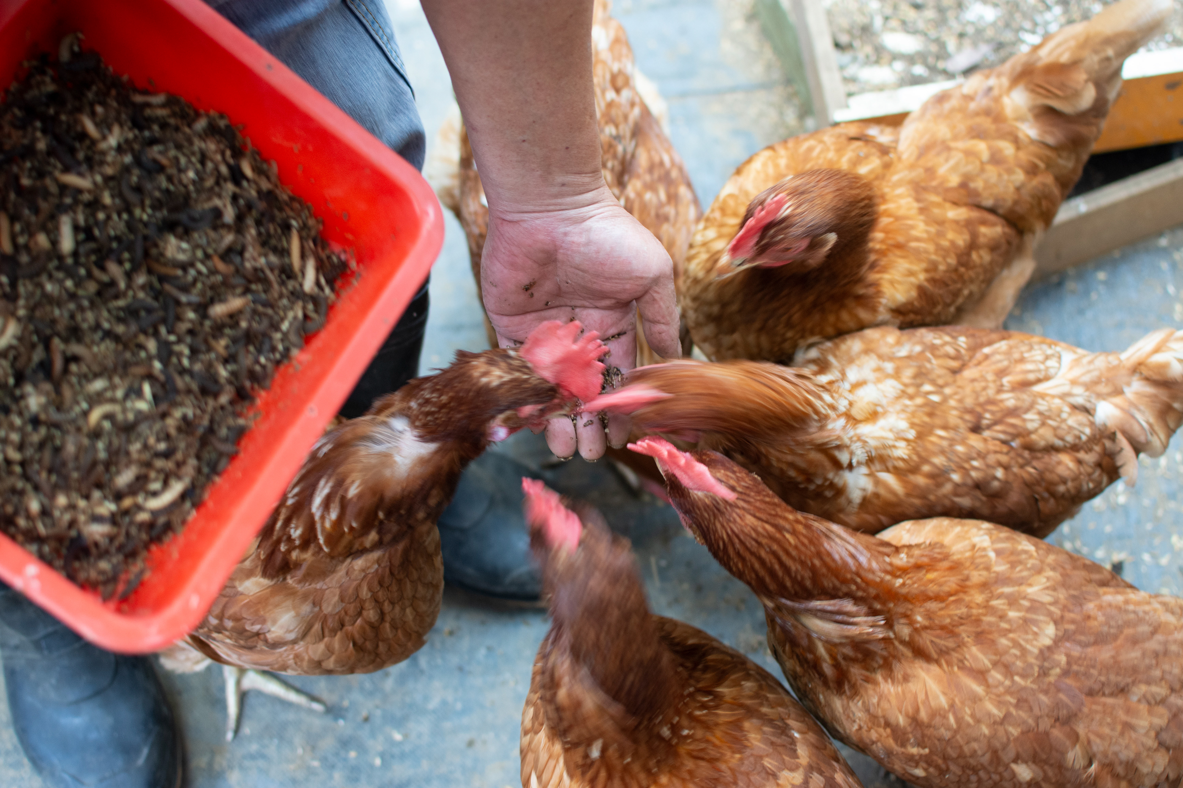 Having been naturally separated from the food waste through the pre-pupation pathway, the larvae in this drawer are ready for other valuable uses, such as feeding chickens.